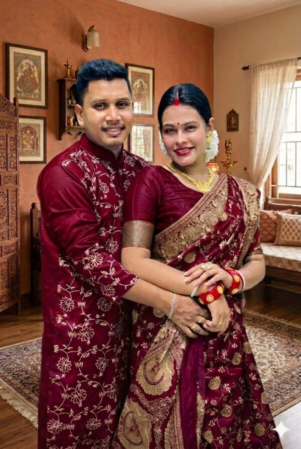 সাথে ধুপিয়ান সিল্ক ফেব্রিক্সে ব্লক প্রিন্ট কাজের স্টাইলিশ ম্যাচিং পাঞ্জাবি।
