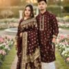 সাথে ধুপিয়ান সিল্ক ফেব্রিক্সে ব্লক প্রিন্ট কাজের স্টাইলিশ ম্যাচিং পাঞ্জাবি।